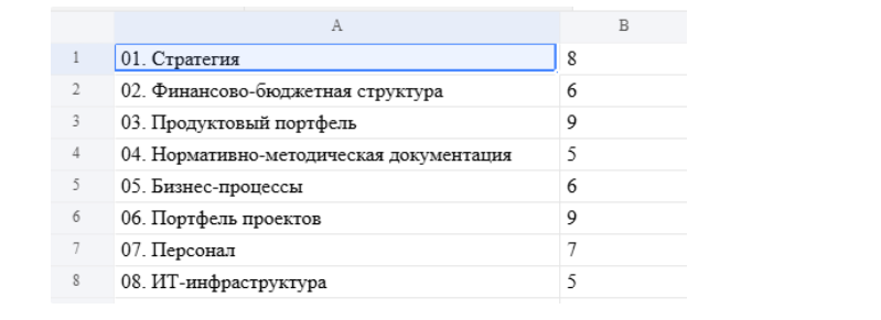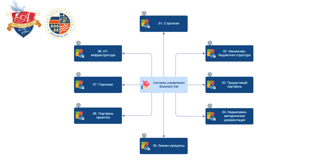 Здесь я их только перечислю: стратегия, финансово-бюджетная структура, продуктовый портфель, нормативно-методическая документация, бизнес-процессы, портфель-проектов, персонал и IT-инфраструктура.