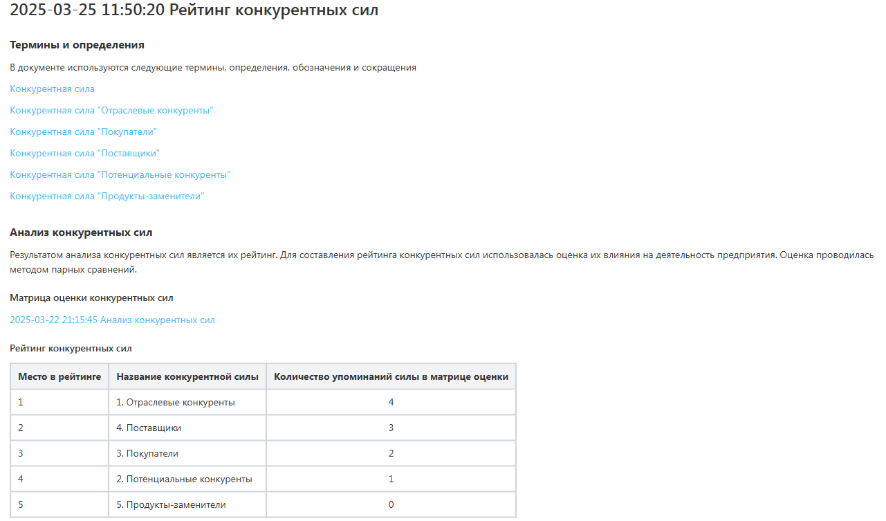Создаем глоссарий модели “5 сил Портера”. Для каждой силы пишем отдельную wiki-статью, в которой определяем каждую силу в разрезе нашего бизнеса. Например, “отраслевые конкуренты” для нас - это кто? Почему мы считаем их нашими прямыми конкурентами? Как они воздействуют на наш бизнес?